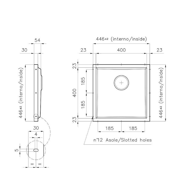 Base 60 cm • Incasso: vedi sito web • Fondo in acciaio AISI 304 satinato • Piletta 3½” + tubo corrugato universale per l’installazione di differente troppo pieno