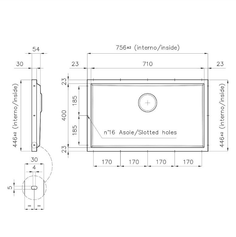 Base 80 cm • Incasso: vedi sito web • Fondo in acciaio AISI 304 satinato • Piletta 3½” + tubo corrugato universale per l’installazione di differente troppo pieno