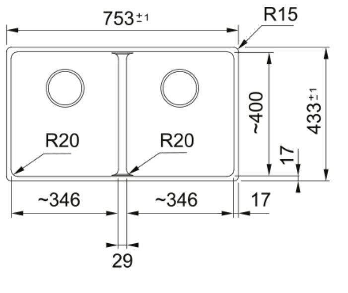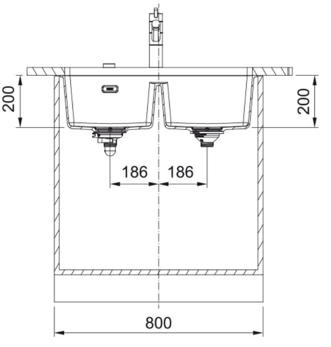 Base: 80 Dimensioni: 753×433 Foro incasso: vedi dima Vasca 2x 346x400x200 mm