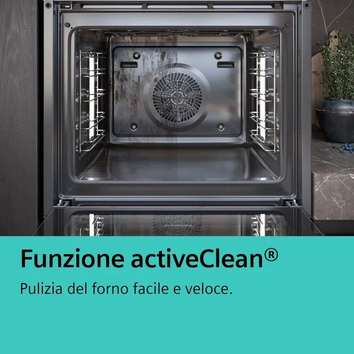 Pulizia del forno facile e veloce.Puoi dire addio a spugne e prodotti per la pulizia del forno. Grazie alla funzione activeClean®, il tuo forno ora si pulisce da solo. Basta rimuovere ogni residuo e il forno fa il resto. Al semplice tocco di u