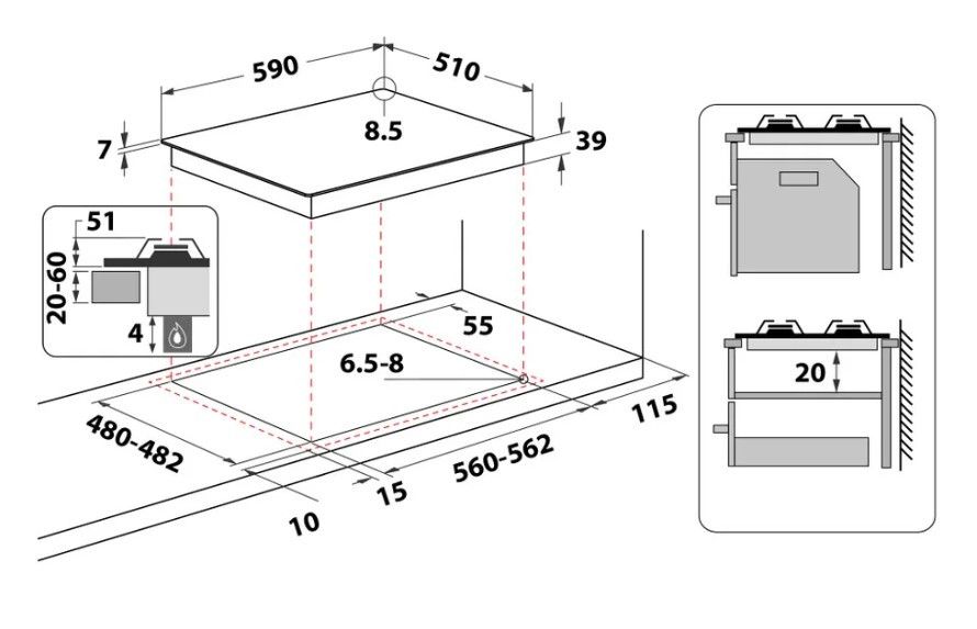 Dati Tecnici Caratteristiche Principali Multilevel Flame Griglie d’appoggio in ghisa 4 bruciatori a gas: 1 doppia corona da 3500 W, 2 semirapidi da 1650 W cad
